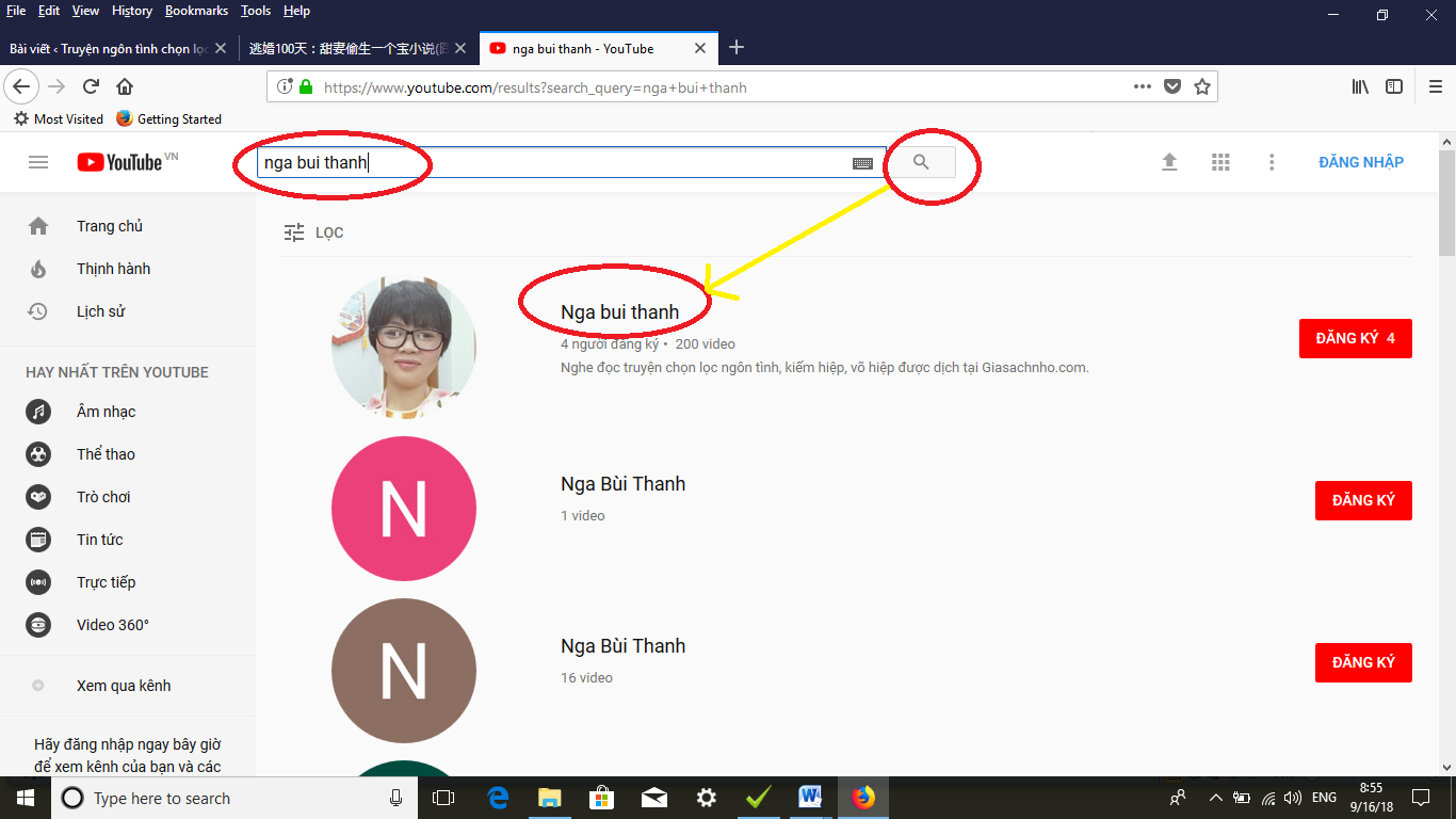 1. Vào Youtube gõ: nga bui thanh như hình hướng dẫn bên dưới.