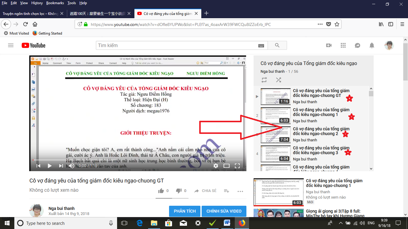 Ví dụ: muốn xem truyện Cô vợ đáng yêu của tổng giám đốc kiêu ngạo, sau khi click vào danh sách phát tất cả bộ truyện, bạn có thể chọn số chương muốn xem, nhìn sang bên phải có danh sách, bạn tìm số chương muốn xem click vào, nó sẽ phát theo thứ tự từ chương đó trở đi.